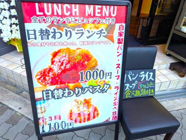 「LUNCH MENU すべてのランチにビュッフェ付き」だそうです。ビュッフェは、自家製パン・スープ・ライス食べ放題のようですね。ランチは、旬の食材やお肉を使った特別なランチの日替わりランチが1000円、日替わりパスタは、トマトソース・クリームパスタ・オイルパスタの全3種類の各1100円です。