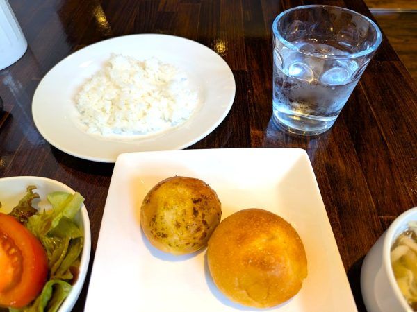 パン(バジルマヨパンとホワイトチョコパン)とライスを少々。ビュッフェ食べ放題のルールがありまして、「食べられるだけお取りください。お残しはご遠慮ください。パンのお残し、持ち帰りは1つ100円だそうです。ルールを守って楽しくお食事しましょう」。るなるなはお腹と相談しながら楽しくいただきます。