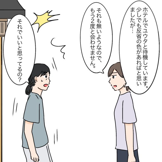 「ホテルでユウタと待機しています。少しでも反省の色があればと思いましたが・・それも無いようなので、もう2度と会わせません」そう言い切ると、「それでいいと思ってるの?」と言い返す義母。