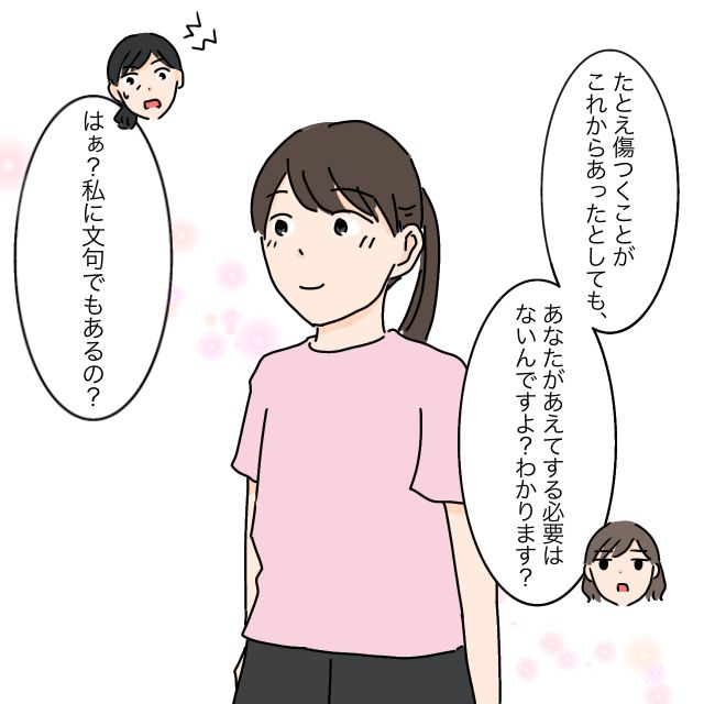 「たとえ傷つくことがこれからあったとしても、あなたがあえてする必要はないんですよ?わかります?」冷静にそう言うと、「はぁ?私に文句でもあるの?」と掴みかかる勢いの義母に、