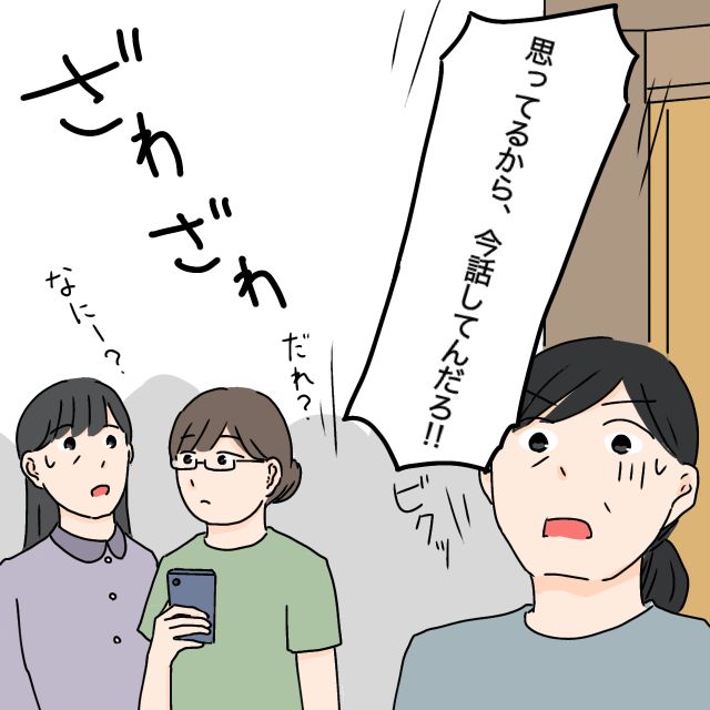 「思ってるから、今話してんだろ!!」と大きな声で言うと、さすがの義母もビクッとし、玄関先でのやりとりに興味津々な周りの人たちも「だれ?」「なにー?」とざわざわし始めました。
