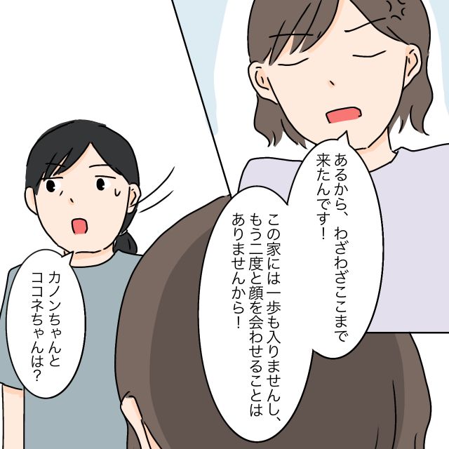 「あるから、わざわざここまで来たんです!この家には一歩も入りませんし、もう二度と顔を合わせることはありませんから!」私がそう言うと、「カノンちゃんとココネちゃんは?」と言い出す義母に、