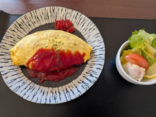 ミニサラダが付いていて軽食というよりしっかり食です。 固めに焼かれた卵は昔ながら系のオムライス。 中のケチャップライスは優しい味付けとなってます。