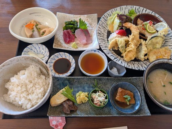 7種類から選べるメイン料理からは「天ぷら盛合せ」、3種類から選べるサブ料理からは「魚の南蛮漬け」をチョイス。 出てきたおも家ランチのボリュームにびっくり!