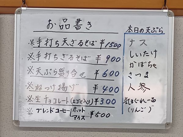 お品書きはこちら。「手打ち天ざるそば」「手打ちざるそば」や、「ねっけ揚げ」「生チョコレート」など面白いメニューも。