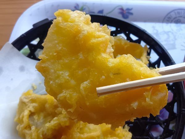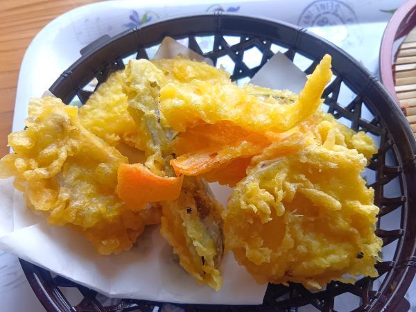 地元で採れた野菜の天ぷらは「ナス、シイタケ、カボチャ、サツマイモ、人参」。一つひとつが大きくサックサク。特にシイタケは肉厚で旨味たっぷり。