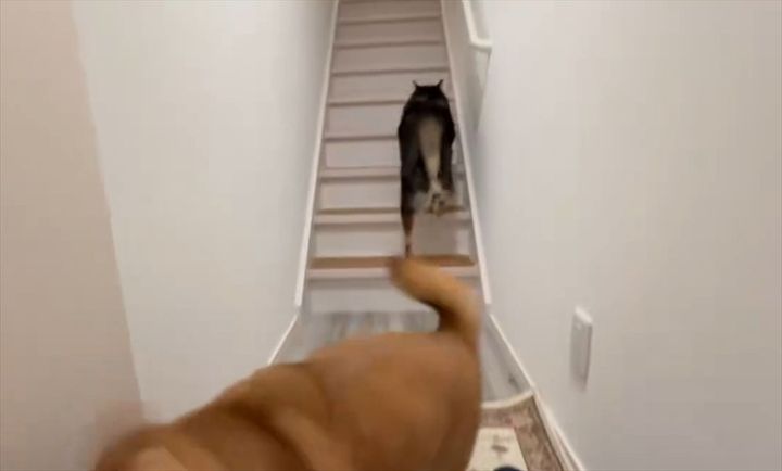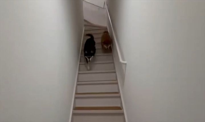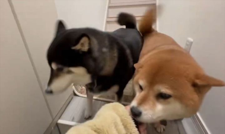 勢いよく階段を下りてくるのは、黒柴の『なな』ちゃん(左)と赤柴の『ぽち』ちゃん(右)。 帰宅した飼い主さんをお出迎えしに来てくれたようです。