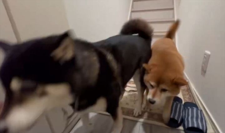 帰宅した飼い主さんを、階段を駆け下りて迎えに来てくれた柴犬たち。 ところが、その直後に思わぬ行動に出た子がいたのです!!