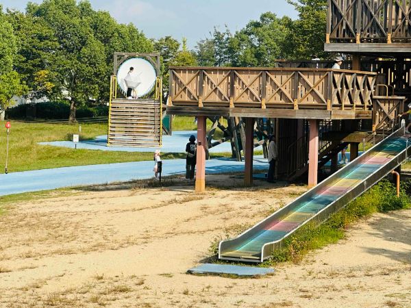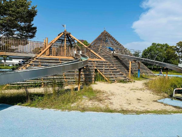 公園に入ってすぐ目を引くのが、まるで冒険のスタート地点のような ピラミッド型のすべり台!