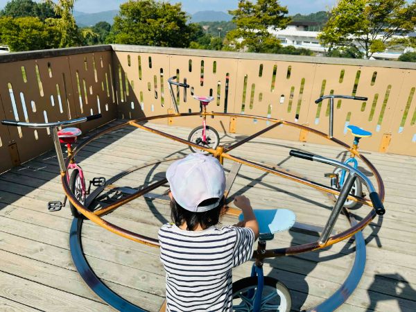 遊具を進んでいくと、自転車型遊具を発見!ペダルをこいでくるくると回ることができます。子どもと一緒に大人もチャレンジしたくなる遊具でしたよ。