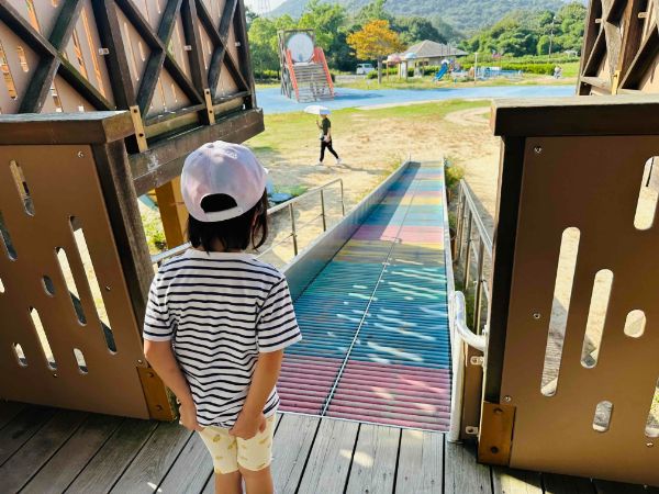 カラフルなかわいいローラー滑り台も発見しました! 幅が広いので、子どもの隣で大人も一緒に滑ることができます。
