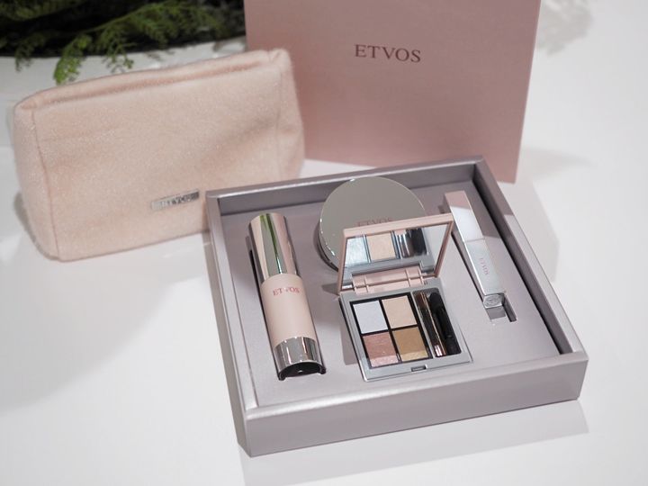 ETVOS 2025 ホリデーコフレ 9,900円(11月5日発売) ★ <セット内容> ・ミネラルインナートリートメントベース マカロンピンク ・ミネラルルーセントパウダー スノーパール ・ミネラルクラッシィシャドー クワイエットグラム ・ミネラルシアールージュ フローズンピンク ・オリジナルポーチ ※予約限定特典