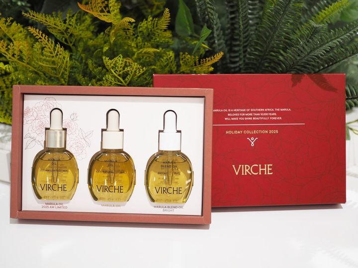 にしきおり:VIRCHEからは、ブランド人気No,1の「マルラオイル」とくすみ(※1)ケアをプラスした「マルラブレンドオイル[ブライト]」に、さらにここでしか手に入らない「マルラオイル 限定ローズの香り」と3本入りの豪華なスキンケアセットが登場しました。「マルラオイル 限定ローズの香り」は、3種のバラの天然精油をブレンドしていて、保湿もかなえながらリッチな香りで癒されます。