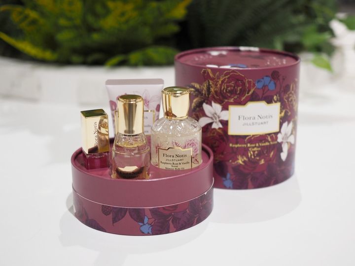 にしきおり:毎年注目しているフローラノーティス ジルスチュアートからは、「ラズベリーローズ&バニラ」の温もりを感じる香りのコフレが登場しました。フレグランスの他にボディオイルとヘアミルク、リップエッセンスがセットになっていて、パーツケアをしながら愛おしい香りに包まれます。