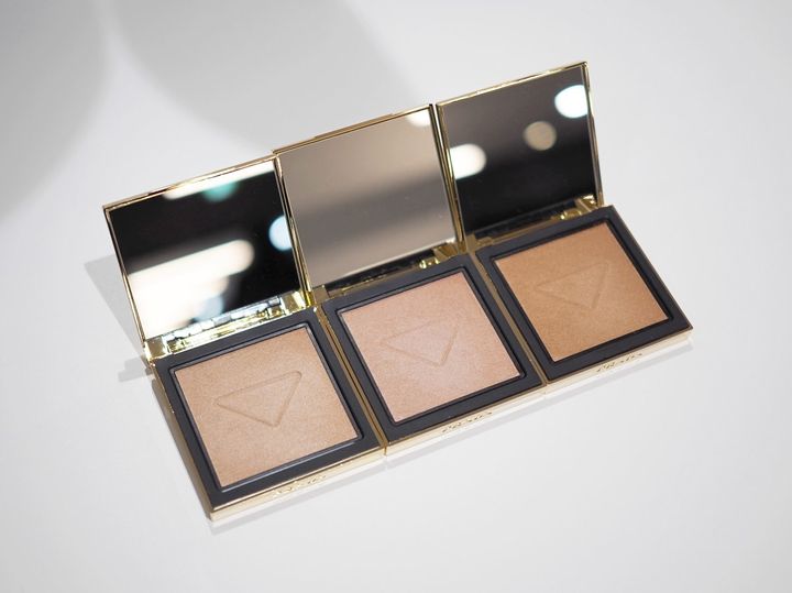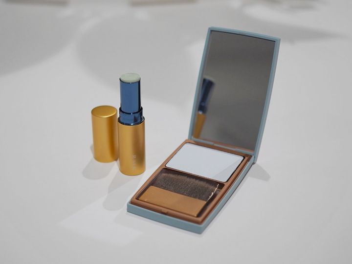 よしかわ:ここからはベースメイク、フェイスカラーの単品アイテムを紹介していきます。プラダ ビューティの「プラダ ライト グローイング パウダー」は、どのカラーもかわいすぎて一つに選べませんでした。ちょうど試した時が日焼けした直後で、小麦肌だから明るいカラーは浮いちゃうかもと思ったんですけど、“どんな肌色にもなじむよう設計”と説明があるとおり、どのカラーもきれいになじんでエレガントな輝きをまとえるんです。なりたい雰囲気のカラーを選んで、肌見せするときにデコルテや肩にものせてもかわいいと思います。