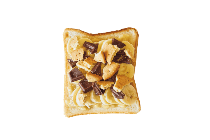 (2)食パン2枚につぶしたバナナを等分に塗り、輪切りのバナナを少しずつ重ねて横3列に並べる。チョコレートとクッキーを手で粗く割って等分に散らし、残りの食パンを重ねる。