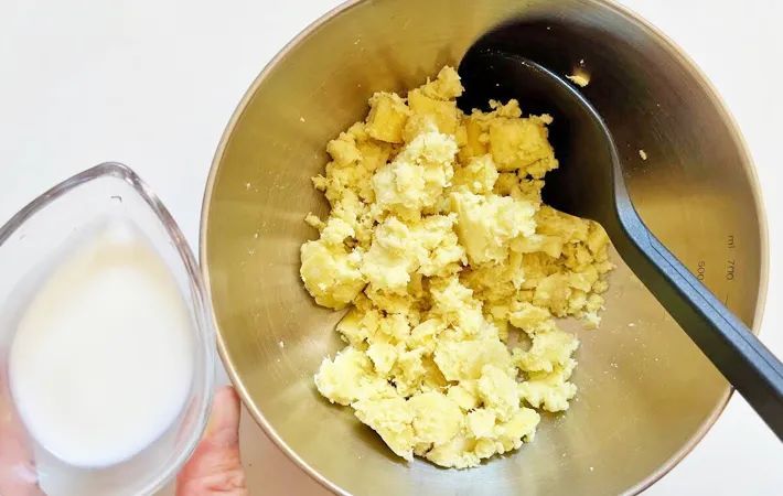 牛乳やバターを加え、なめらかになるまで混ぜます。