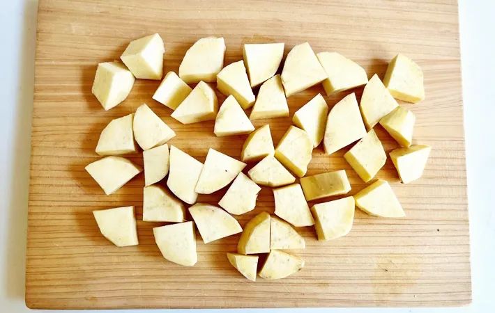 皮をむいてひと口大に切り、水に数分さらしたら水気を切ってください。