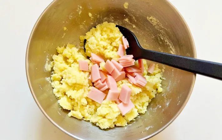 角切りにしたハムを加えて、さっと混ぜ合わせましょう。