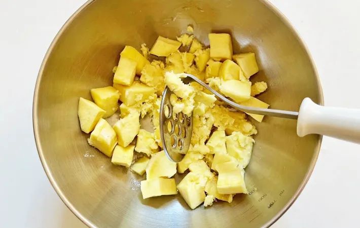 サツマイモが熱いうちにマッシャーやフォークでつぶしましょう。