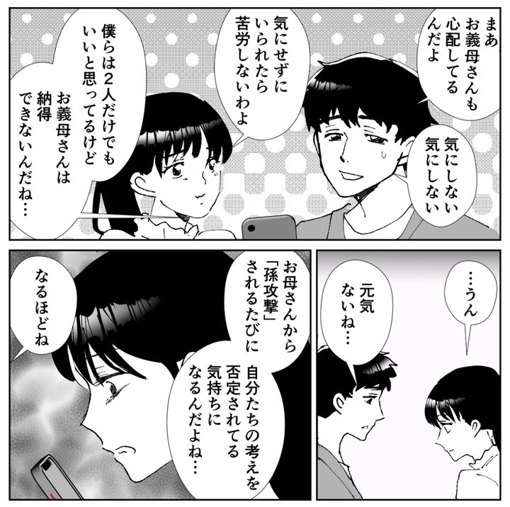 私はアイネ。夫のユキヤと2人暮らしです。結婚して2年ほど経ちましたが、子どもを授かる気配はまったくありません。しかし夫とは「子どもはいてもいなくてもいいよね」という話になっているので、そこまで焦っているわけでもありません。夫婦で2人仲よく暮らせていれば、それでいいじゃないですか。しかし最近になって、母から「孫は?」と言われるようになりました。昔から仲よしでよく連絡をとりあう母でしたが、これはさすがに鬱陶しいです。