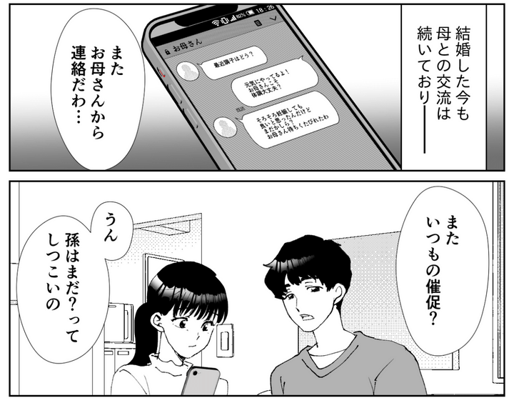 母は相変わらず過干渉で、私が家庭を持った今でも頻繁な連絡は続いています。結婚した当時の私は、夫と「できれば早めに子どもが欲しいね」などと話していました。しかしなかなか授かることができず、今では母から「孫はまだ?」と何度も催促されます。