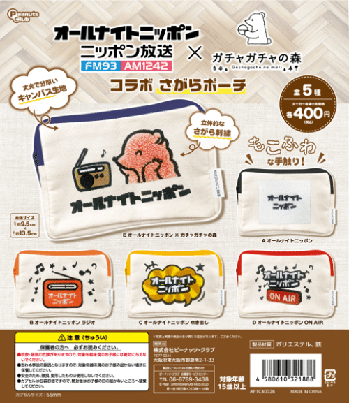 番組ロゴの刺繍入りポーチが登場! オールナイトニッポン×ガチャガチャの森 コラボさがらポーチ発売!