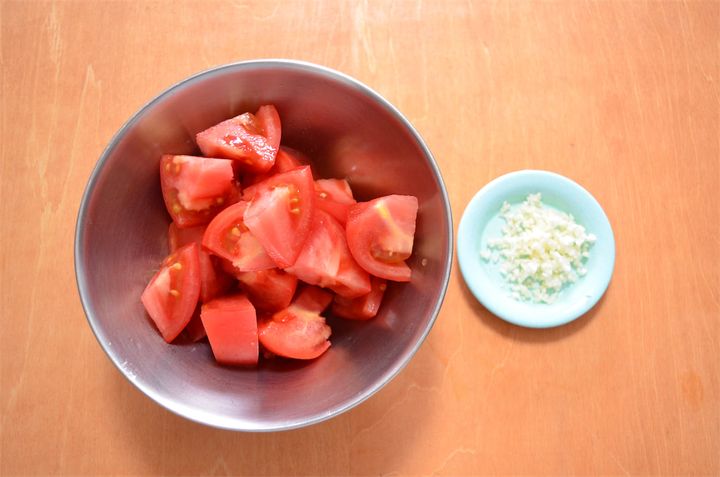 1. トマトはヘタを取って大きめの一口大に切り、にんにくはみじん切りにする。