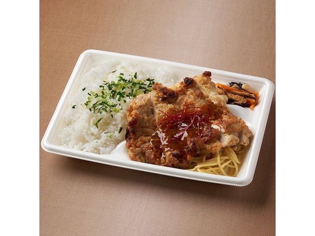 ナツメグ・クミン・オールスパイスを使用した、スパイシーなから揚げに、花椒・ブラックペッパーなどをまぶした、スパイスの香るから揚げ弁当です。別添の黒コショウでさらにスパイス感を調整できる仕立てです。