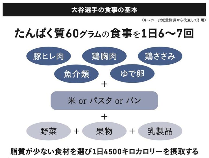 大谷選手の食事の基本は、脂質が少なく、たんぱく質60グラムのおかずを1日に6〜7回とることです。