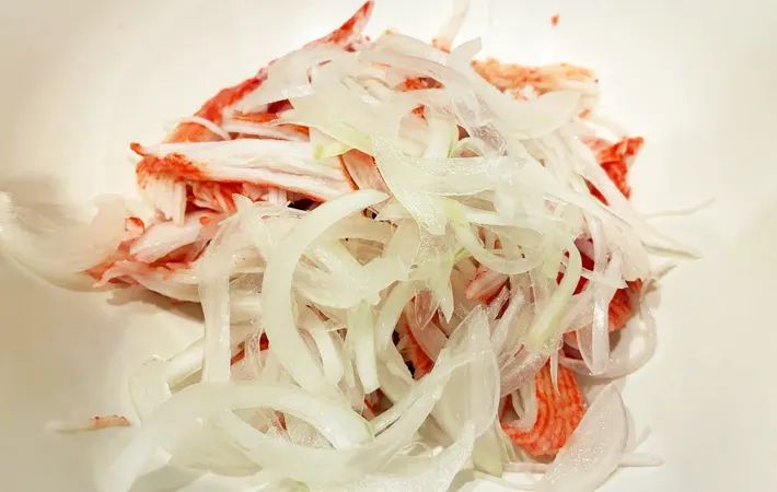 そこに、カニカマとタマネギを加えてよく混ぜたら、器に盛っていきましょう。