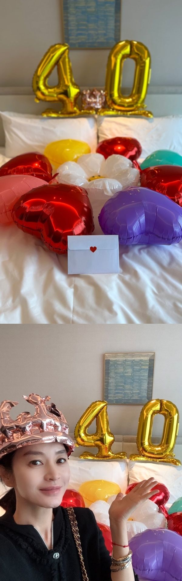 写真には、ベッドの上に置かれた大きな“40”の数字バルーンや色とりどりのハートバルーン、小さなカードの前で、笑みを浮かべるキム・ヘスの姿が収められている。