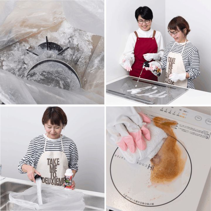 五徳や換気扇は、油汚れがこびりつき落とすのが大変なところ。鍋やフライパンの裏も、サッと洗うだけではガチガチの汚れが取れず積み重なってしまうことがありますよね。そんな汚れも、力を使わなくても気持ちいいくらいにスルッと落とせる方法を教えていただきました!