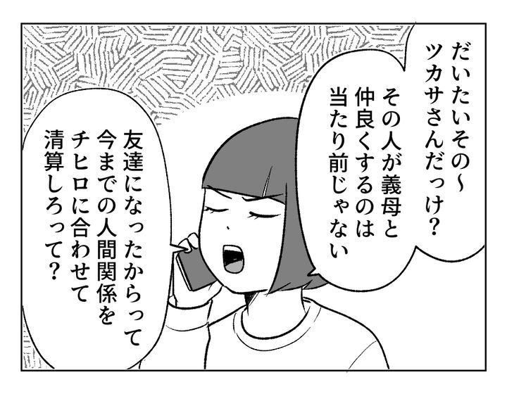 私(チヒロ)は、長男・レオを出産後に退職。しかし夫・マナブの一馬力ではマイホーム資金は貯まらないので、「3年間の期間限定」で義実家で同居をはじめました。しかし義母の口出しがひどく、私は早々に疲れてしまったのです。そんなときツカサさんと出会い、すっかり意気投合。ところがツカサさんが義母と知り合いだと判明! さらにツカサさんと義母が仲良く談笑している姿を見てしまいます。ツカサさんは表面的には私の味方のような態度を取っておいて、心の中では義母の味方だったのでしょう。ツカサさんと距離を置くべく、私はすべての誘いを断り続けたのでした。しかし幼馴染からは「あんたの頭の中は園児と同じレベル」と言われてしまい……?
