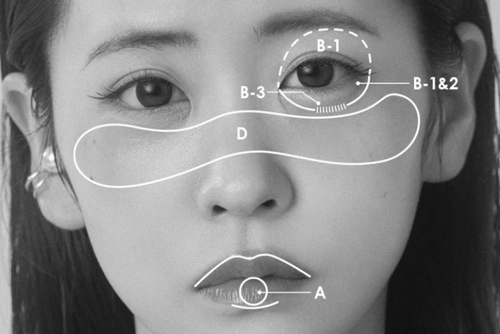 Dを指にとり、両ほおをつなぐイメージで鼻を横断してつける。