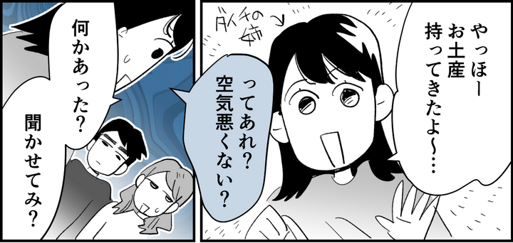 夫婦喧嘩から数日、ダイチとは気まずいままです。義姉がお土産を持ってきてくれると、すぐに私たちの様子に気が付きました。