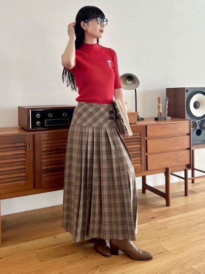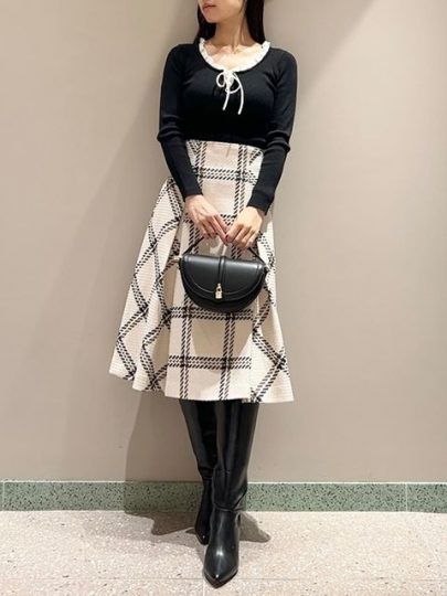 2025年は、ミディ丈スカートにロングブーツを組みあわせるのがトレンド。フレアなチェック柄スカートなら、クラシカル感が引き立ち大人の気品が漂います。ブーツにあわせて、トップスやバッグはブラックでまとめてきちんと感を引き立てましょう。