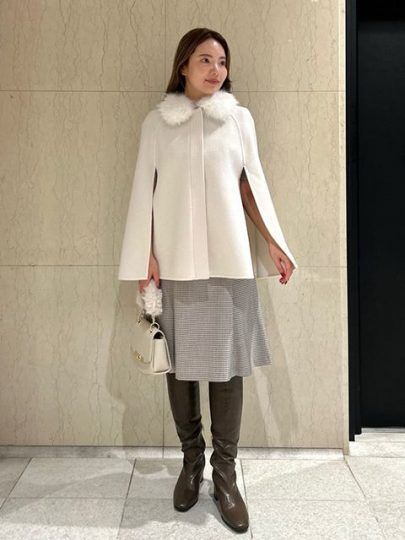 クラシカルなミニワンピースは、ロングブーツとバランスを取りやすいので冬コーデでも大活躍。今年は、ケープコートを上から羽織ることできれいめなコーデにワンランクアップします。抜け感を出すために、バッグはミニサイズをあわせるのが正解。コートにあわせてレディライクにまとめましょう。