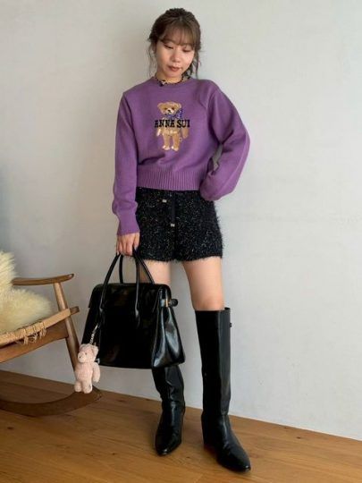 アウターを着る冬シーズンは、パッと目を引くアクセントカラーのニットが映えます。柔らかいパープルカラーなら、上品さもあってチャレンジしやすいです。ミニ丈のボトムスをあわせたら、ロングブーツで自然に肌見せをカバーしましょう。