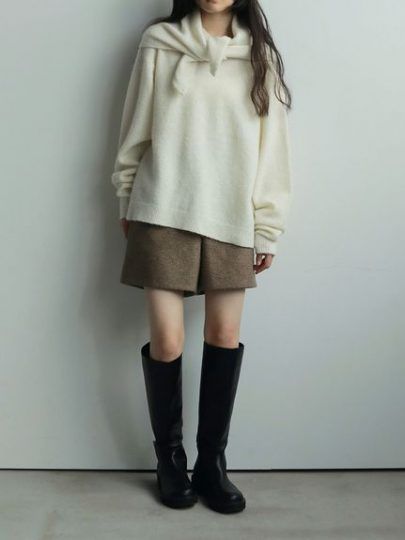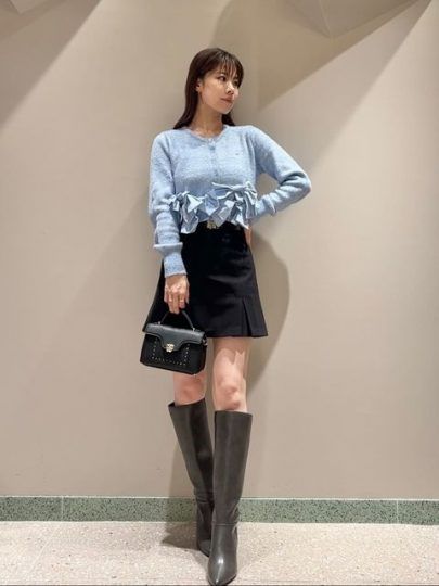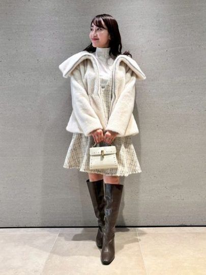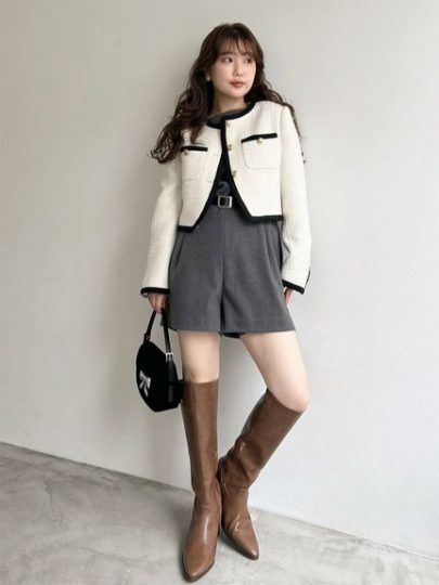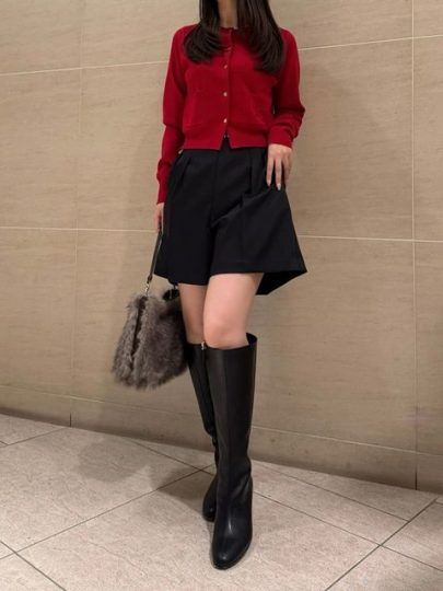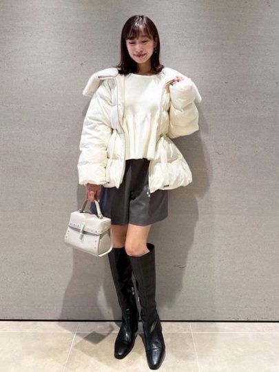 冬にミニ丈ボトムスを取り入れるなら、ロングブーツが防寒的にもマスト。台形のショートパンツなら、チラリと見える脚が細く見えます。