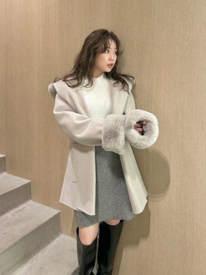 ミニ丈の台形スカートなら、ロングブーツとあわせて冬のスタイルアップコーデを作りましょう。スカートの裾がちらりとのぞく丈感のミドルコートなら、絶妙なバランスが実現します。ファー付きならフェミニンに垢ぬけます。