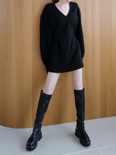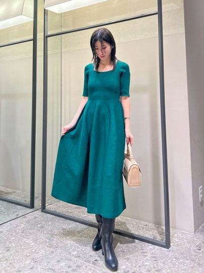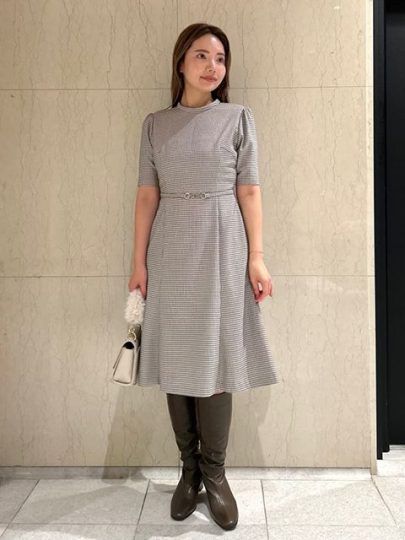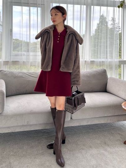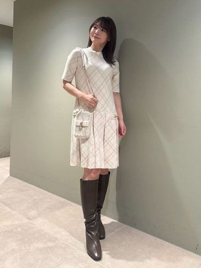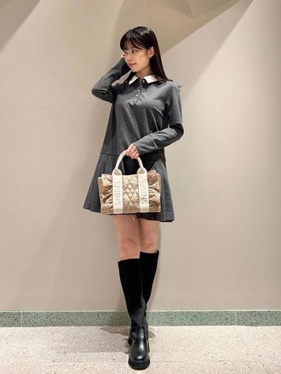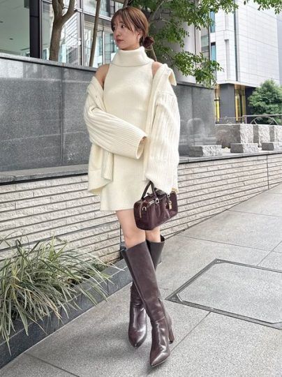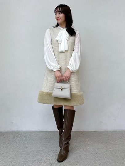上品な襟付きミニワンピースは、ロングブーツだとバランスを取りやすくて相性抜群。ニットブーツを選ぶことで、ほどよく脚のラインにフィットしてスッキリとしたシルエットを叶えてくれます。あえて明るい色のバッグで抜け感を出すとおしゃれ見えします。