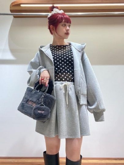 フーディーとミニスカートのスウェットセットアップは、ズルッとしたシルエットとハリのあるポンチ素材で旬顔を実現。シアーなトップスを仕込むことでおしゃれな印象に。ロングブーツで足元を引き締め、野暮ったさを防止しましょう。