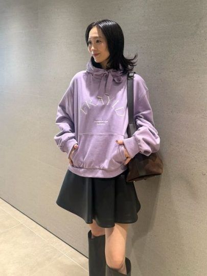 ざっくりオーバーサイズのフーディーは、ラベンダーカラーなら春らしくて大人カジュアル。ミニ丈のプリーツスカートをあわせれば、今年らしいカレッジスタイルの完成です。