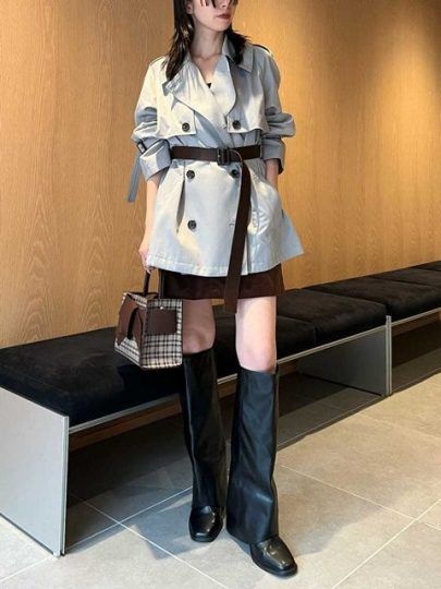 春の定番トレンチコートは、ショート丈ならロングブーツともバランスを取りやすくておすすめ。ミニスカートをあわせ、チラリと脚を肌見せして抜け感を出しましょう。