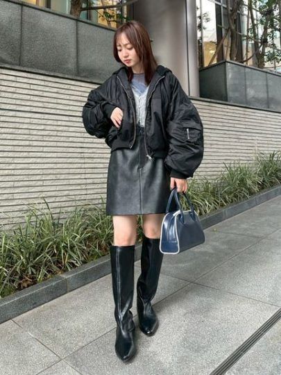 ショート丈のMA-1ジャケットは、カジュアル派さんなら1着はゲットしておきたい人気アウター。冬は、レザースカートで季節感を出すのがおすすめ。あえてロングブーツもブラックでまとめて洗練されたワントーンコーデを作りましょう。