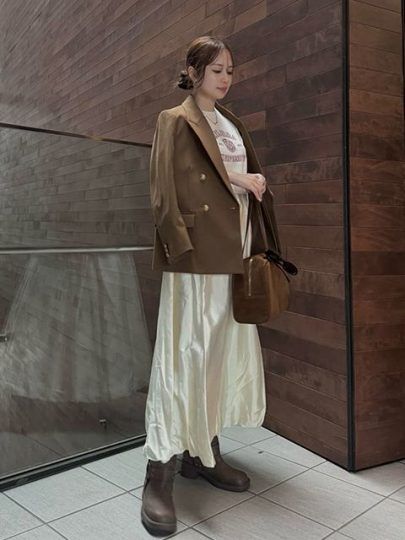 あえてブラウンのロングブーツにするとモードになりすぎず上品見えします。