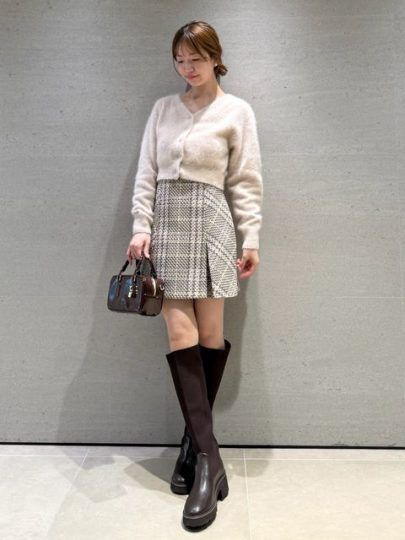 スッキリタイトなロングブーツには、コンパクトな台形スカートをあわせるとスタイルアップ効果抜群!チェック柄を選ぶと、秋らしいクラシカルな雰囲気が漂います。
