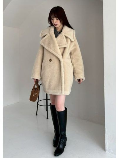 オーバーサイズのムートンコートは、ミニ丈のボトムスやワンピースとあわせると大人可愛い印象に。ちらりと脚を肌見せしたら、ロングブーツで真っ直ぐ細いシルエットを作りましょう。