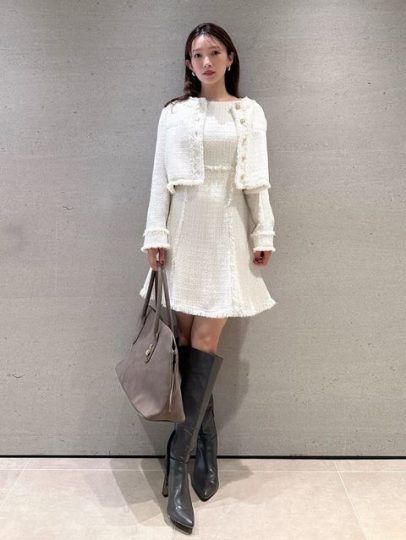 春のオケージョンシーンにも映えるツイードのセットアップ。思い切ってホワイトで全身コーデを作ったら、ロングブーツはダークカラーで引き締めましょう。